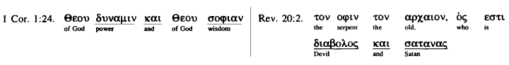 And as the insertion of the copulative kai between nouns of the same case, without articles, (according to the fifth rule,) denotes that the second noun expresses a different person, thing, or quality, from the preceding noun, so, likewise, the same effect attends the copulative when each of the nouns are preceded by articles, as in the following examples -