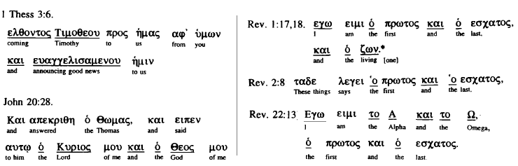 The sixth rule also applies specifically to both personal and non-personal nouns. The effect is exactly the same as the fifth rule. When both nouns have the definite article, they refer to different things. Sharp was careful to explain the exceptions, which apply to both the fifth and sixth rules. Notice that only personal nouns may fall under the exception, which is: when both nouns are clearly stated within the context to refer to the same person. Examples are Thomas' exclamation, "My Lord and my God." Since in the context he was clearly addressing both nouns to Jesus' person, this falls within the exception. Another example, where the same person is addressed with two nouns, is Jesus' statement, "I am the first and the last." Since Jesus specifically applied both titles to Himself within the context, this also falls within the exception to the sixth rule. When no such direct statement occurs within the context applying both nouns to a single person, the nouns refer to different things or persons. Sharp was clear that any alleged exceptions to the fifth or sixth rules MUST have a clear singular personal application or they cannot be considered exceptions. A case in point is Matt. 28:19. "the name of the Father and the Son and the Holy Spirit" (TSKTSKTS). The use of the article before each noun indicates each of these are distinct persons.
